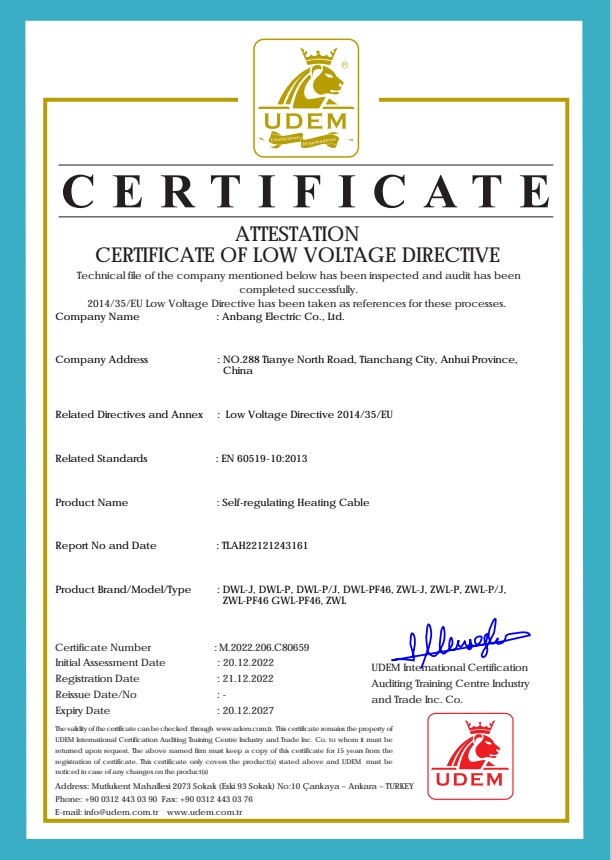 安邦電氣股份有限公司,總部位于北京市長安街,成立于2004年,注冊資金10088萬。安徽生產(chǎn)基地占地面積63000平方米,擁有66套各類生產(chǎn)線,其中進口生產(chǎn)線6套。國家高新技術型企業(yè),滁州市市長質量獎企業(yè),專精特新“小巨人”企業(yè),擁有國家知識產(chǎn)權局授權的45項專利,其中發(fā)明專利28項 , 主筆《太陽能熱利用自限溫電熱帶安裝規(guī)范》行業(yè)標準,參編《自限溫電伴熱帶》國家標準、《工業(yè)和商業(yè)用電阻式伴熱系統(tǒng)》國家標準、《太陽能熱利用自限溫電熱帶》行業(yè)標準、《爆炸性環(huán)境 電阻式伴熱器》國家標準等7項國家標準。企業(yè)通過UL認證,國家強制性 CCC產(chǎn)品認證,ISO9001質量管理體系認證,ISO14001環(huán)境管理體系認證,ISO45001職業(yè)健康安全管理體系認證,Q/SHS0001.1健康、安全與環(huán)境管理體系認證,歐盟防爆ATEX認證,歐盟CE認證,RoHS認證,俄羅斯海關聯(lián)盟認證,國家防爆電氣CCC證書。產(chǎn)品系列:集膚伴熱系統(tǒng)、電伴熱系統(tǒng)、電加熱器、電地暖系統(tǒng)、集儀器儀表、電線電纜、高低壓配電柜(箱)、電纜橋架、閥門管件等等設計、制造、銷售。產(chǎn)品應用于航天航空、軍工、石油、石化、天然氣、機場、化工、鋼鐵、隧道、消防、養(yǎng)殖、融雪化冰、室內(nèi)供暖、國家電網(wǎng)及眾多電廠等等國家重點工程。出口美國、英國、德國、俄羅斯、韓國、日本、哈薩克斯坦、烏克蘭、伊朗等眾多國家。